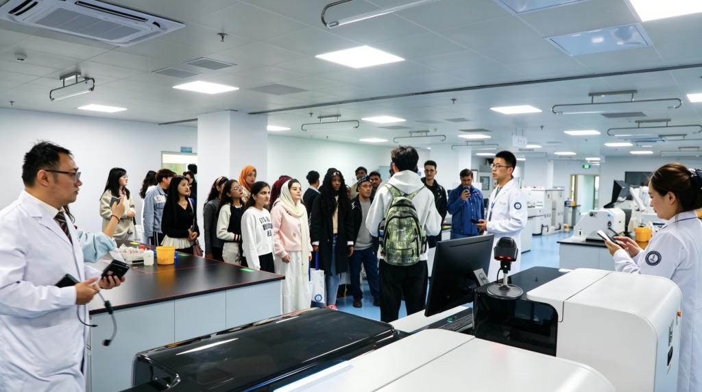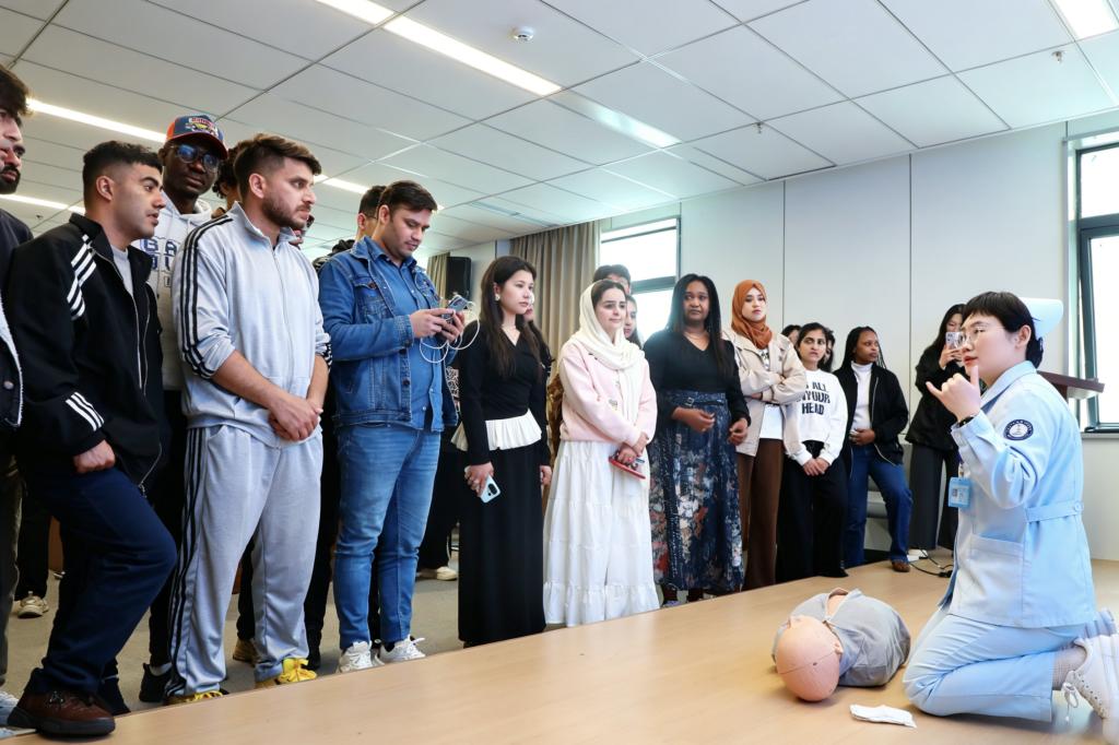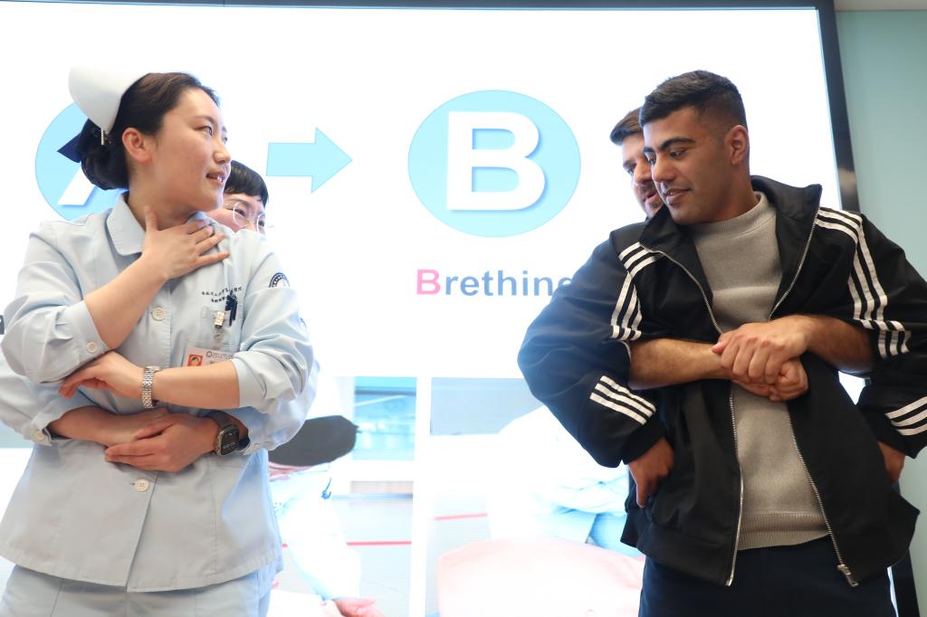 急诊急救中心两位专家为同学们讲解了急救知识,并为现场演示了海姆立克急救法和心肺复苏的标准化操作流程。留学生们在导览人员的带领下,参观了一附院南区检验中心与影像中心。