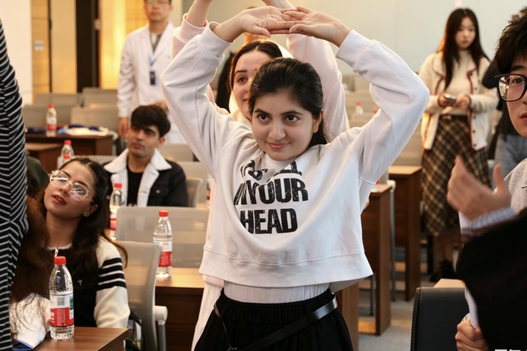 伴随着悠扬的音乐,留学生们摆开架势,跟着中医专家一招一式地比划起八段锦来。乌兹别克斯坦女孩兴奋地表示:“这就像中国功夫一样!做完这套动作,我的手在发热。”