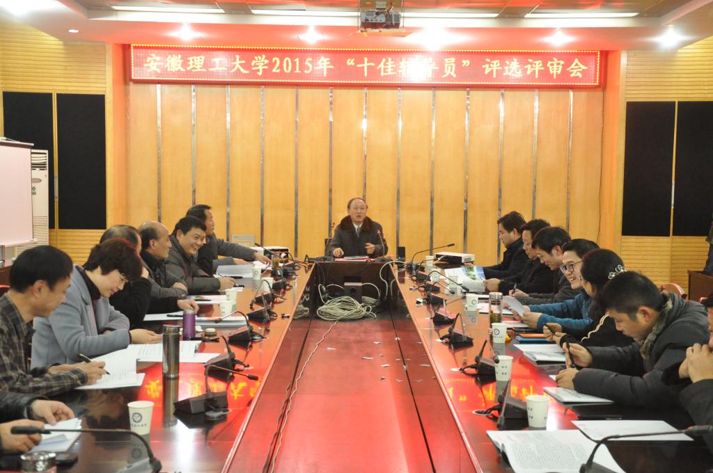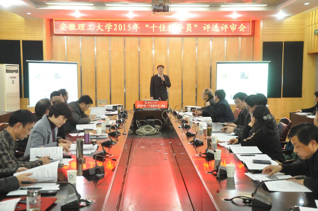经个人自评和学院初评推荐,共有16位辅导员老师参加校“十佳辅导员”评选,根据公开、公平、公正原则,组织专家进行网络评审和现场考评,共评出任少伟、李洁、赵埕萱、杨志华、李攻明、吕金梅、张娜、宫盼盼、张坤、邵飞等10位老师为2015年度安徽理工大学“十佳辅导员”。