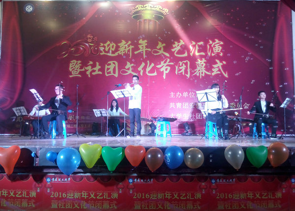 12月26日晚,北校区大学生活动中心光影交错、人声鼎沸。全校66个学生社团汇聚于此,共同举办2016年迎新年社团文艺汇演暨社团文化节闭幕式,标志着我校第十六届大学生社团巡礼与社团文化节圆满落幕。