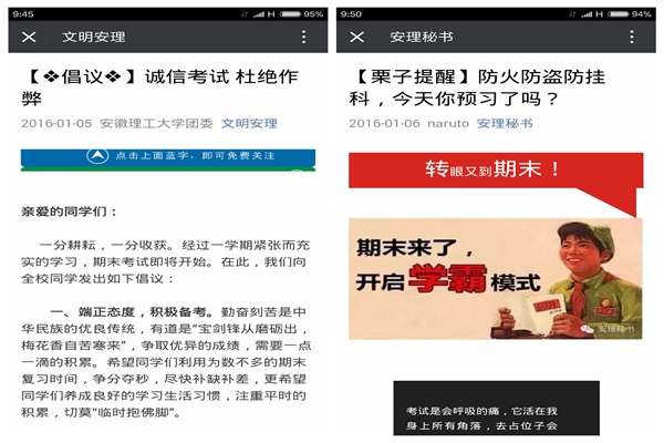 1月6日,又在“安理秘书”微信平台推送《防火防盗防挂科,今天你预习了吗》的后续推文,号召大家开启“学霸”模式,不缺勤,制定复习计划,合理安排复习时间,广泛收集复习资料,得到众多同学围观点赞。同学们纷纷晒出自己的感想和体会,表达充分备考,诚信迎考的决心。