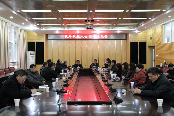 1月12日下午,在校本部图书馆北侧会议室,学校召开了党外代表人士2015年度校情通报会。校党委书记颜事龙、党委副书记王洪出席了会议。省文史馆馆员、各级人大代表和政协委员、各民主党派基层组织负责人、校党外知识分子联谊会负责人以及有关职能部门负责人参加了会议。