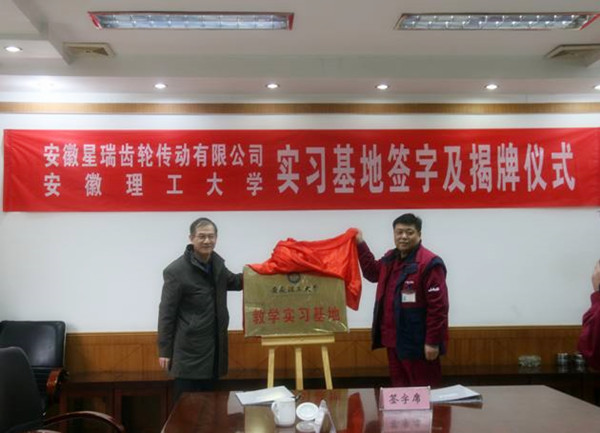 1月20日下午,我校与安徽星瑞齿轮传动有限公司的教学实习基地签字与揭牌仪式在六安市安徽星瑞齿轮传动有限公司举行。副校长王其东出席仪式。教务处副处长刘群红,机械工程学院院长王传礼、副院长王开松,以及公司总经理陶诚等相关领导参加了揭牌仪式。