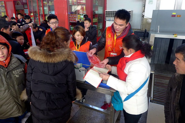 大学生志愿者们有的为出行旅客发放新版列车时刻表,耐心解答旅客疑问;有的打开医药箱,为有需要的乘客提供免费药品;有的送上车站原创设计的“福”字窗花,让来往旅客提前感受到春节的氛围;有的帮助老人和孩子提拿行李物品,将温暖送到每一个旅客的身上。他们一流的优质服务、一流的精神状态得到了旅客们的好评和肯定,充分展示了我校青年学子良好的精神风貌和综合素质。