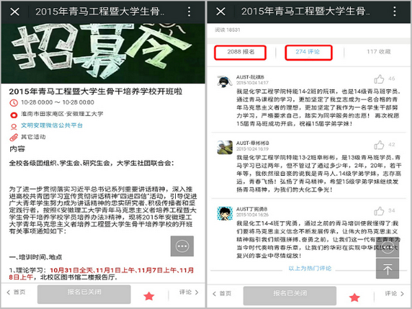截至2015年底,已有436个团学组织的23790名师生用户入驻掌上校园(Myouth)平台,累计发布活动580项、资讯966条。全校目前共有335个团支部的10018名团员每天活跃在该平台的团支部社区上,社区访问量目前已超过10万人次,累计发布各类青年学生思想动态、班级主题团日活动和人物风采36801条。
