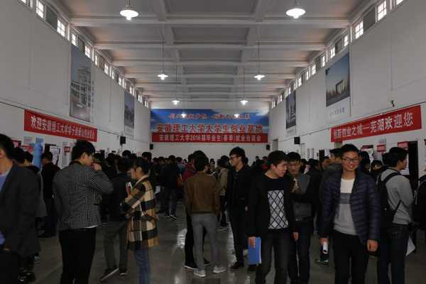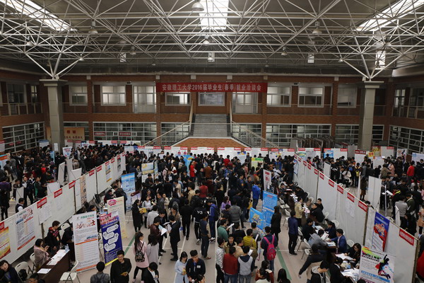 3月26日上午,安徽理工大学2016届毕业生就业(春季)洽谈会在大学生素质教育中心和大学生创业基地同时举行。153家用人单位、320名用人单位代表应邀来校招聘毕业生,共提供1500多个就业岗位。其中,萧山人才交流中心组织19家企业,芜湖人才交流中心组织8家企业、金寨县人社局组织2家企业在大学生创业基地出席洽谈会。3000多名毕业生进入洽谈会现场寻找就业机会,近1000名毕业生现场签订了就业协议、或与用人单位达成了就业意向。