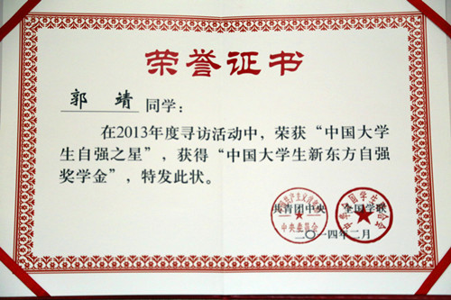 土木建筑学院学生郭靖获“中国大学生自强之星”荣誉称号