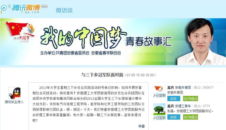 五年来,积极运用微博、微信等各类网络新媒体开展思想引领、成长服务和组织建设工作,团属网站“安理工青年——安徽理工大学团委”获“全国高校百佳网站”称号,多次受到团中央官微和《中国青年报》、《中国教育报》、中国青年网等中央级媒体的报道和推广;多次受邀在全国高校新媒体发展论坛、全省共青团网络宣传引导工作推进会、全省共青团新媒体网宣工作座谈会、团省委年中工作交流会上介绍经验;建立了一支覆盖广、动员快、战斗力强、政治觉悟高的2236人组成的新媒体工作团队;2014年,学校获批团中央学校共青团重点工作创新试点项目(团学工作网络新媒体战略转型),并连续获2014年度、2015年度团中央学校部颁发的全国“掌上校园”(Myouth)创新试点优秀单位称号;2015年,与安徽团省委、中国移动安徽有限公司三方共建了全国首个学校战线共青团新媒体工作“智库”——安徽省学校共青团新媒体工作研究中心,并作为全省高校代表参加了团中央书记处第一书记秦宜智来安徽调研的2场专题座谈会。
