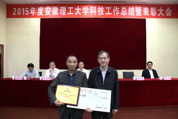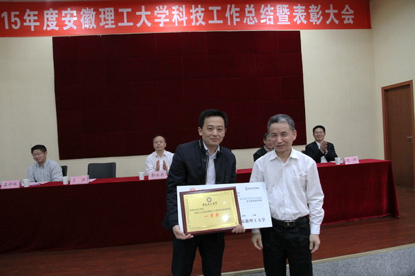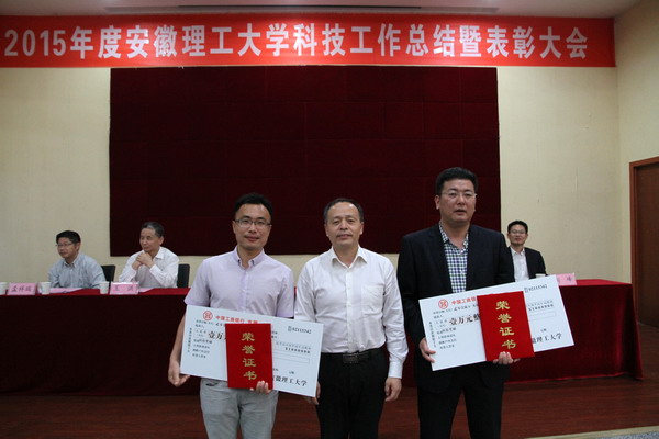 副校长叶醒狮宣读了学校对2015年度科技贡献集体奖和个人奖的表彰决定。校长郭永存为2015年度科技贡献奖个人奖黄友锐、王建国两位同志颁奖。校党委副书记王洪、副校长王其东、校纪委书记周峰分别为2015年度校科技贡献集体奖一等奖能源与安全学院、二等奖地球与环境学院、三等奖理学院颁奖。