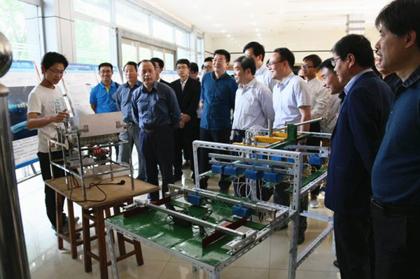 5月4日下午,校长郭永存在教务处、实验室与设备管理处、学生处、校团委等相关职能部门领导的陪同下,来到校本部实验中心一楼大厅,亲切看望即将代表学校参加第七届全国大学生机械创新设计大赛安徽赛区竞赛的学生和指导老师,并观摩了21件参赛作品。