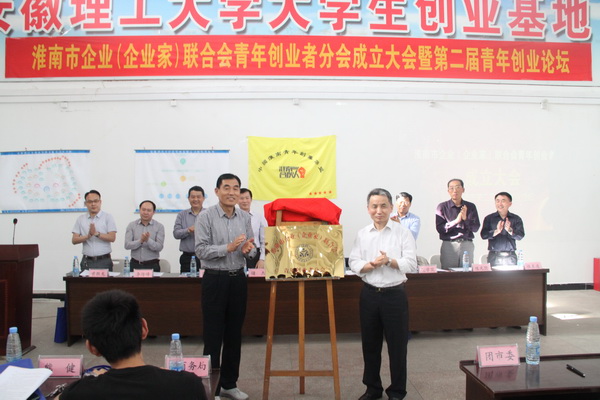 王洪和梁立文共同为淮南市企业(企业家)联合会青年创业者分会揭牌。