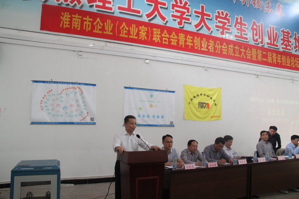 王洪强调,我校是国家级大学生创新创业训练计划实施高校和“安徽省普通高校大学生创新创业教育示范校”。近年来,学校积极与淮南市人社局合作,建立“淮南市大学生创业培训安徽理工大学基地”;经省人力资源和社会保障厅认定并获评“安徽省大学生创业模拟实训培训基地”;积极开展创业意识培训(GYB)、创办企业培训(SYB)和创业模拟实训,累计参加各类培训(实训)学生数近万人次;积极扶持学生创业项目,至今已累计扶持项目119个,其中科技创新项目类64个,公司实体项目类55个。青年创业者分会会长钱鹏是我校2014大学生创业基金扶持项目负责人,他的项目在学校大学生创业孵化基地成功孵化,现在注册了安徽创壹家投资管理有限公司,就是其中成功的代表。