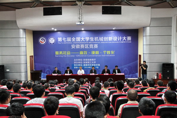 全国大学生机械创新设计大赛在全国大学生机械创新设计大赛组委会和教育部机械基础课程教学指导分委员会指导下举办,每两年举办一次。本届大赛以“服务社会——高效、便利、个性化”为主题,具体内容涉及钱币的分类、清点、整理机械装置,不同材质、形状和尺寸商品的包装机械装置,商品载运及助力机械装置。安徽赛区比赛由安徽省教育厅主办,安徽理工大学承办,淮南市科学技术局协办,共有来自全省32所高校156件作品参加最后的终审决赛,参赛作品的数量和质量都创历届大赛之最。