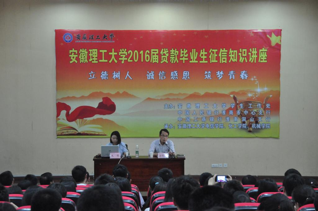 5月25日下午,由安徽理工大学与中国人民银行淮南市中心支行、中国工商银行淮南洞山支行共同主办的2016届贷款毕业生征信知识讲座在六角楼报告厅举行。活动共分为征信知识宣讲、现场互动交流和主题签名活动等三个环节。