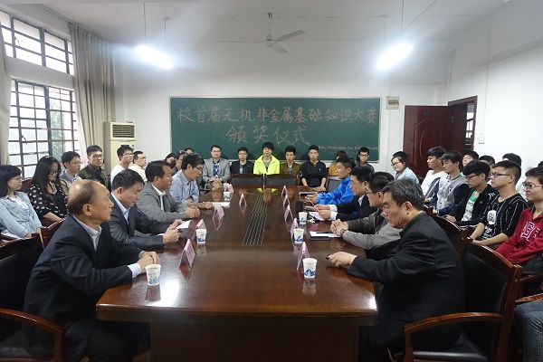 5月27日下午,校首届无机非金属材料基础知识大赛颁奖仪式在材料科学与工程学院403会议室举行。副校长叶醒狮以及实验室与设备管理处处长苏嘉银、学生处处长田中良、校团委书记赵宁、创新学院副院长张东速等相关职能部门负责人出席仪式。材料学院院长朱金波主持颁奖仪式,副院长刘海增、党委副书记范洪喜以及无机非金属材料工程系全体教师及本次大赛全体获奖同学参加颁奖仪式。
