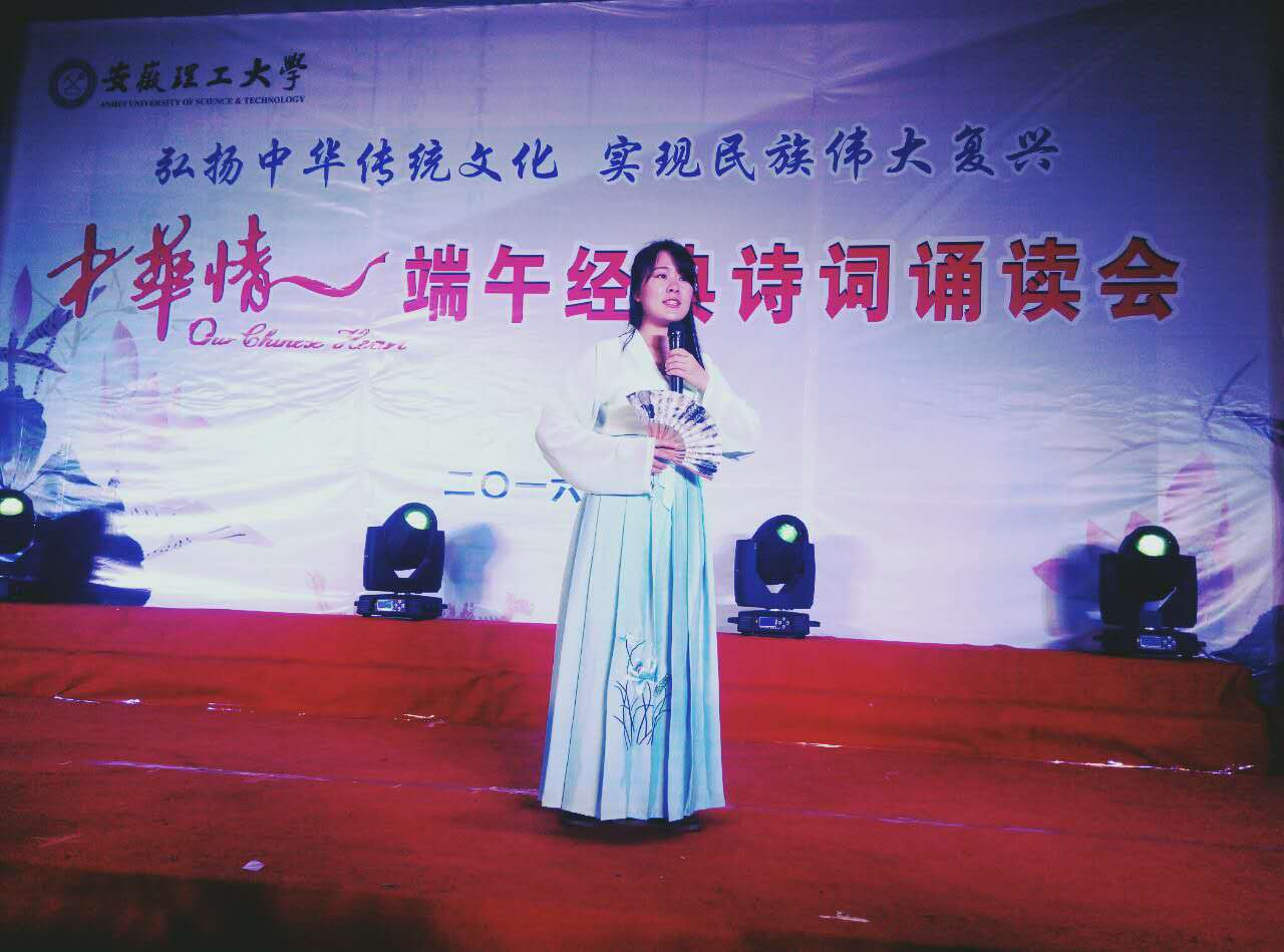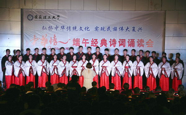 本次诵读会以“弘扬中华传统文化,实现民族伟大复兴”为主题,以缅怀伟大的爱国诗人屈原的端午节为主线,共分为“汨罗殇”、“菖蒲香”、“屈魂颂”三个篇章。在庄严悠扬、古韵古香的器乐声中,40名身着汉服的学生演员从舞台两侧揖礼而出,齐声诵读《离骚》节选,一开场便激发了全场观众心中的家国情怀。随后,演员们依次诵读了舒頔的《小重山·端午》、边贡的《午日观竞渡》、刘禹锡的《竞渡曲》、欧阳修的《渔家傲·端午》、苏轼的《端午游遍诸寺得禅字》等脍炙人口的古体诗词以及余潇雨的《端午节的情思》、王祯辅的《菖蒲·雄黄艾、龙舟》、老舍的《七律·端午》等近现代作家的新体诗、散文诗。他们时而声音洪亮、激情澎湃,时而肃穆庄严、以诗言志,时而缠绵悱恻、语短情长,完美诠释了我国源远流长的端午节历史和传统文化内涵,博得了全场观众的阵阵喝彩。