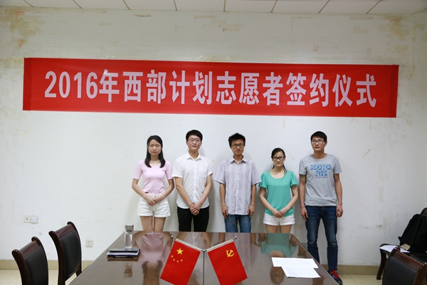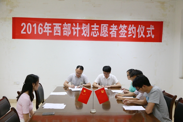 6月21日上午, 我校2016年大学生志愿服务西部计划招募协议签订仪式在大学生素质教育中心会议室举行。校团委副书记黄胜龙代表学校项目办与5名入选志愿者正式签订了《2016年大学生志愿服务西部计划招募协议书》,标志着我校2016年西部计划志愿者招募工作圆满结束。