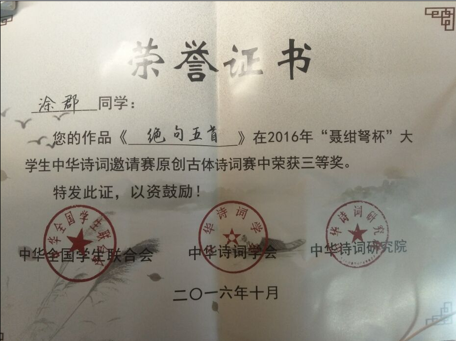 近日,2016年“聂绀弩杯”全国大学生中华诗词邀请赛决赛在华中师范大学隆重举行。经过激烈的角逐,我校化学工程学院制药工程专业2013级学生涂郡作品从全国677件参赛作品中脱颖而出,凭借七言律诗《绝句五首》同来自香港大学、澳门大学、北京师范大学等学校在内的12个原创古体诗词作品进入全国决赛,并荣获三等奖,是唯一理工科专业获奖选手。