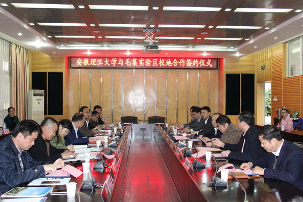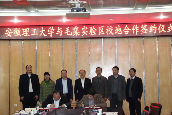 11月15日下午,安徽理工大学与毛集实验区管理委员会校地合作签约仪式在校本部图书馆一楼北会议室举行。校党委书记郭永存、副校长孟祥瑞,毛集实验区工委书记、人大工委主任赵期中,工委副书记、政协工委主任管恒川,淮南市科学技术局副局长王安锐出席签约仪式。签约仪式由孟祥瑞主持。
