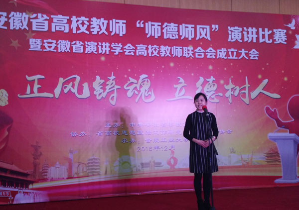 12月1日至3日,由中共安徽省委教育工委主办、省高校思想政治工作研究会、省演讲协会协办、合肥工业大学承办的安徽省高校教师“师德师风”演讲比赛暨安徽省演讲学会高校教师联合会成立大会在合肥工业大学举行。外国语学院肖婷老师代表我校参赛,经过激烈角逐,在全省79所高校参赛选手中脱颖而出,最终以第四名的成绩获得本次比赛二等奖。
