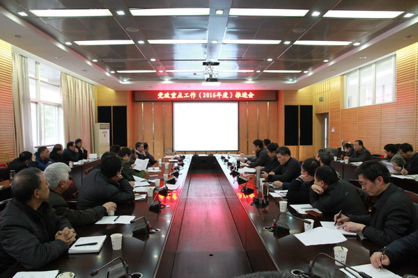 为进一步统一思想,凝聚人心,激发广大党员干部的使命感和责任感,更好地推进学校2016年度党政重点工作的完成,12月6日下午,学校在图北会议室召开党政重点工作推进会。校党委书记郭永存主持会议。校长王其东、党委副书记王洪、纪委书记周峰、副校长郑明东出席会议。