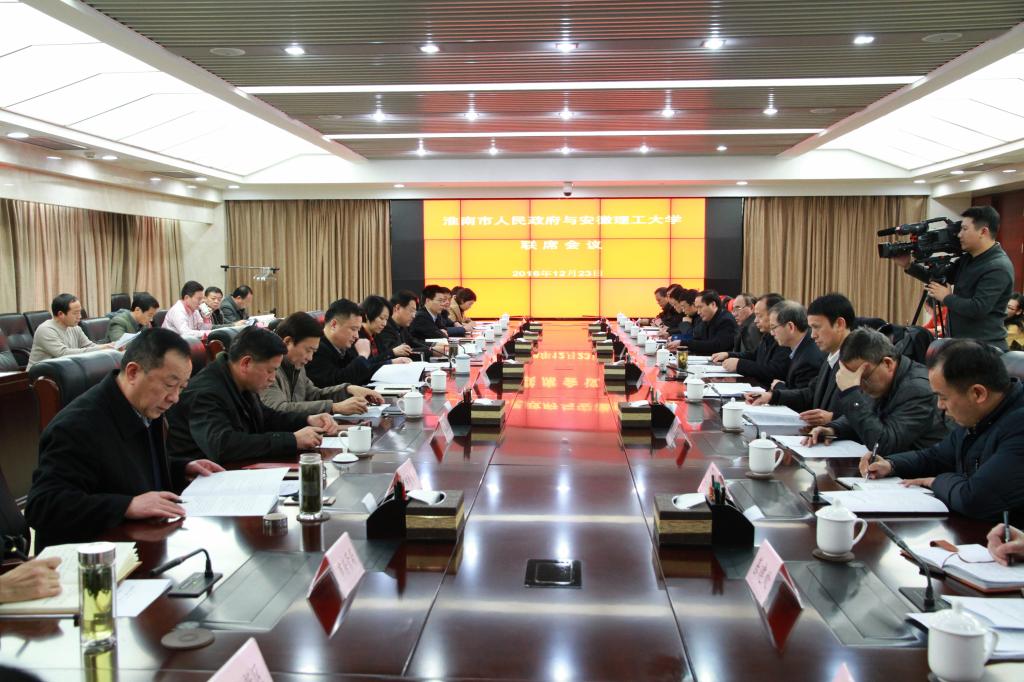 12月23日下午,在淮南市政府A座6楼第一会议室,淮南市长王宏主持召开淮南市政府与安徽理工大学对接会商工作会议,就新校区建设和学校发展需要市里支持和合作的事项,进行了对接会商。淮南市委常委、常务副市长袁方,学校党委书记郭永存、校长王其东、副校长郑明东出席会议。