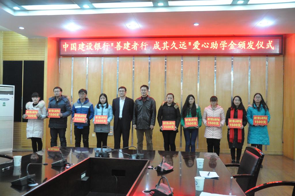 1月5日下午,中国建设银行“善建者行 成其久远”爱心助学金颁发仪式在本部图书馆一楼会议室隆重举行。校纪委书记周峰、建行淮南市分行副行长张松茂出席仪式并共同为受助学生颁发爱心助学金。仪式由学生处处长田中良主持。