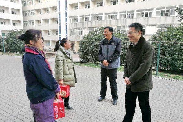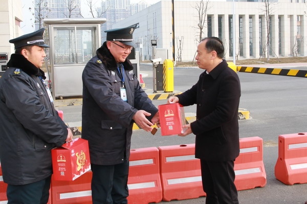 郭永存、孟祥瑞和周峰分别来到新校区和校本部及北校区、西校区,深入四个校区门岗、保卫处警务室、新校区综合办公室、学生公寓、教学楼和行政楼、配电室、家属区物业等值班室,看望慰问仍坚守岗位的工作人员,给他们送去节日的祝福和慰问品,向他们为了学校安全稳定,坚持节假日值班表示感谢。校领导还关心询问他们的生活安排情况,叮嘱他们注意安全,注意防寒保暖,祝愿他们过一个愉快祥和的春节!