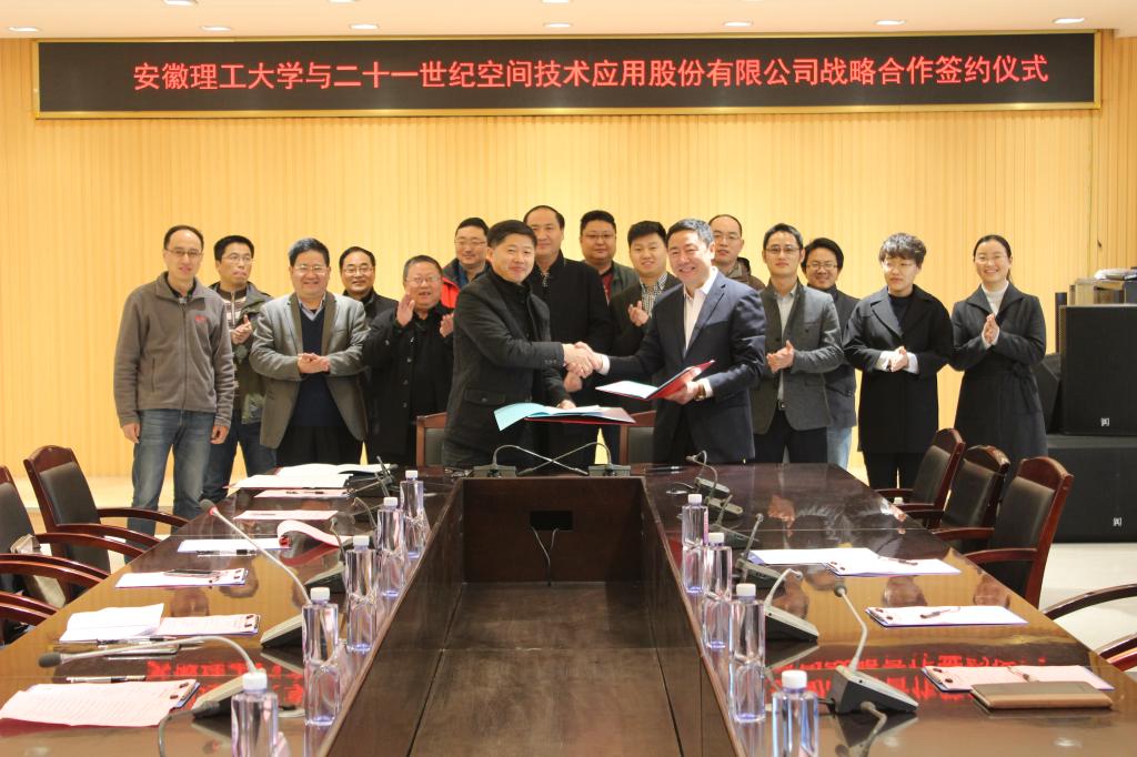 签约仪式上,孟祥瑞和杨耀武代表双方签署了安徽理工大学与二十一世纪空间技术应用股份有限公司战略合作协议。协议约定双方将在国产遥感卫星大数据生产应用方面加强科研合作,并选拔优秀学生进入北京总公司和淮南分公司实习,至签订协议前双方已围绕合作议题开展了实质性工作。