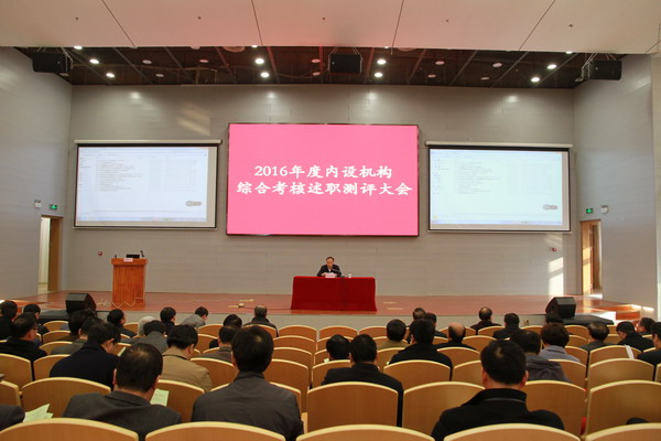 3月9日全天,学校在舜耕会堂召开2016年度内设机构综合领导班子和领导干部考核述职测评大会。校党委书记郭永存主持会议并讲话。党委副书记、校长王其东,党委副书记、副校长袁亮,副校长孟祥瑞、郑明东出席会议。