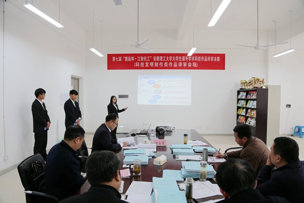 3月17日,我校第七届“挑战杯•江南化工”大学生课外学术科技作品竞赛终审决赛在厚德馆大学生活动中心成功举行。校党委书记郭永存、校长王其东到现场指导比赛。校有关职能部门负责人和相关学科领域教授等17位专家担任评委。来自全校13个学院72支作品团队近300人参加比赛,千余名师生到场观摩。