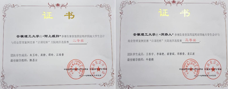 4月21日至23日,由中国国际商会与中国商业会计学会共同主办,美国管理会计师协会(IMA)中国教育分会学术支持的第四届两岸四地大学生会计与商业管理案例竞赛“启课程杯”大陆地区选拔赛在北京成功举办。由我校经济与管理学院陈昌云、牛俊晓两位教师分别指导的“陌上缓归”、“同路人”两支队伍在该比赛中获得二等奖、三等奖。
