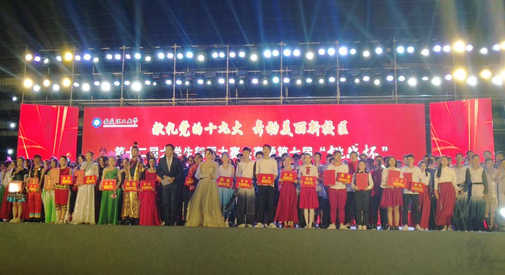 6月4日晚,为喜迎党的十九大,向前来参加第七届“挑战杯”安徽省大学生课外学术科技作品竞赛的全省48所高校团委负责同志、500多名参赛师生展示校园文化育人成果,学校在至诚体育场举办“献礼党的十九大 舞动美丽新校区”第十二届大学生舞蹈大赛暨第七届“挑战杯”安徽省大学生课外学术科技作品竞赛专场舞蹈晚会。团省委副书记李国阳、学校部副部长马志华,淮南团市委书记陈亚东,校党委书记郭永存,校党委常委、副校长宫能平等领导出席活动并为获奖舞蹈颁奖。全校各职能部门、各学院近8000名师生一起观看了精彩的晚会。