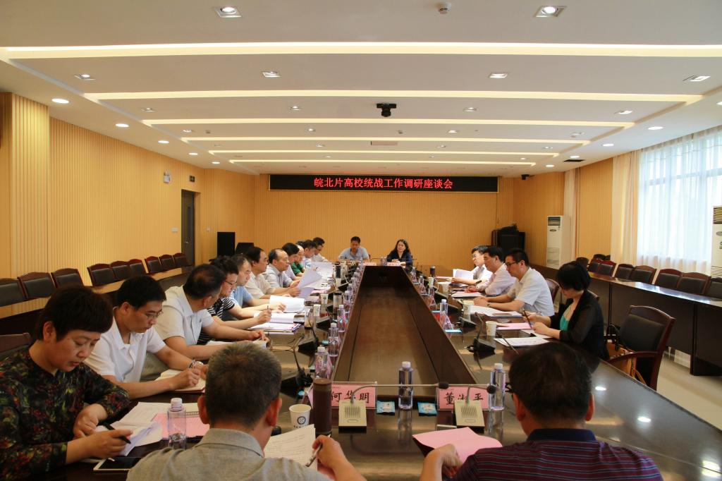6月8日下午,皖北片高校统战工作调研座谈会在我校舜耕苑二楼会议室召开。由省委教育工委副书记庆承松带队,省委教育工委组干处处长程宗林、副处长余奕祥,省委统战部党外知识分子处主任科员郑琼为成员的省高校统战工作调研组一行来我校调研统战工作,并与包括我校在内的10所皖北片高校的校领导、统战部门负责人进行座谈交流。校党委书记郭永存,校党委常委、副校长吴照明出席会议。