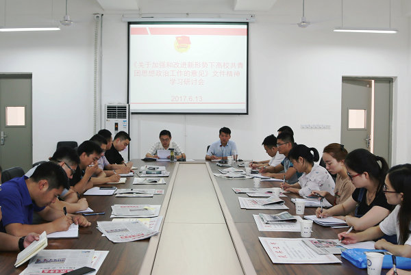6月13日,校团委全体工作人员、各学院团委负责同志在厚德馆二楼团委会议室集体学习全国高校共青团思想政治工作电视电话会议、全国高校共青团思想政治工作会议总结会会议精神以及共青团中央、教育部联合印发的《关于加强和改进新形势下高校共青团思想政治工作的意见》文件精神,重点学习了《意见》中的“六个强化”:一是强化组织育人,不断提升团学组织的吸引力凝聚力;二是强化实践育人,积极促进大学生素质提升、全面发展;三是强化文化育人,努力在校园中弘扬主旋律、传播正能量;四是强化网络育人,大力创新推动网络思想政治工作;五是强化服务育人,坚持将解决思想问题与解决实际问题紧密结合;六是强化保障支持,开创协同推进高校共青团思想政治工作的良好局面。校团委书记赵宁要求各级团组织要将会议和《意见》精神作为制定学校共青团改革方案的重要指引,紧紧围绕立德树人这一中心环节,认真研究贯彻落实会议精神的具体举措,充分发挥共青团在全程育人、全方位育人中的积极作用,引领广大青年学生坚定不移听党话、跟党走。