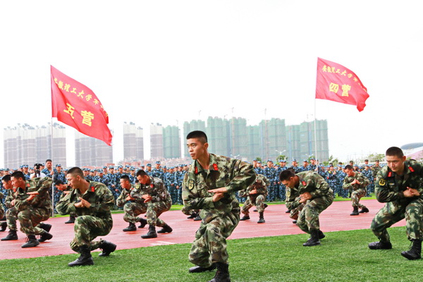 开训仪式在嘹亮的《中国人民解放军军歌》声中结束。5500多名同学将身着迷彩戎装开始为期2周的军事训练。