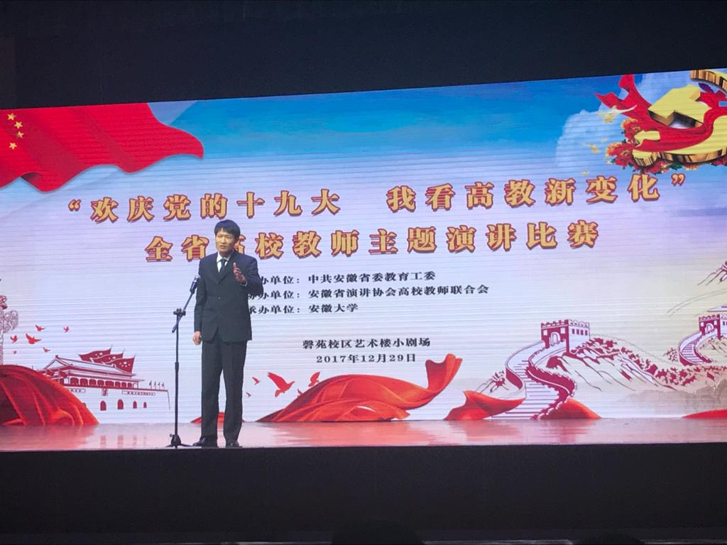 2017年12月29日上午,由中共安徽省委教育工委主办、安徽省演讲协会高校教师联合会协办、安徽大学承办的“欢庆党的十九大 我看高教新变化”全省高校教师演讲比赛决赛在安徽大学磬苑校区举行。马克思主义学院代先祥老师代表学校参赛,并荣获二等奖。