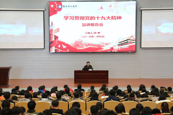 周峰结合国际国内的新形势、新情况,联系实际,从党的十九大的主题和主要成果、习近平新时代中国特色社会主义思想等方面,对十九大精神进行阐释。周峰希望广大师生员工把思想和行动统一到习近平新时代中国特色社会主义思想上来,把智慧和力量凝聚到党的十九大作出的重大决策部署上来,学懂弄通、做实做细;不忘初心,牢记使命,把十九大精神落实到学校各项事业发展和党的建设全过程,努力以新的思路举措、新的精神面貌、新的发展成果,树立新时代的新形象,展示新时代的新气象,实现新时代的新作为,积极构筑和努力实现学校新时代的“复兴梦”。