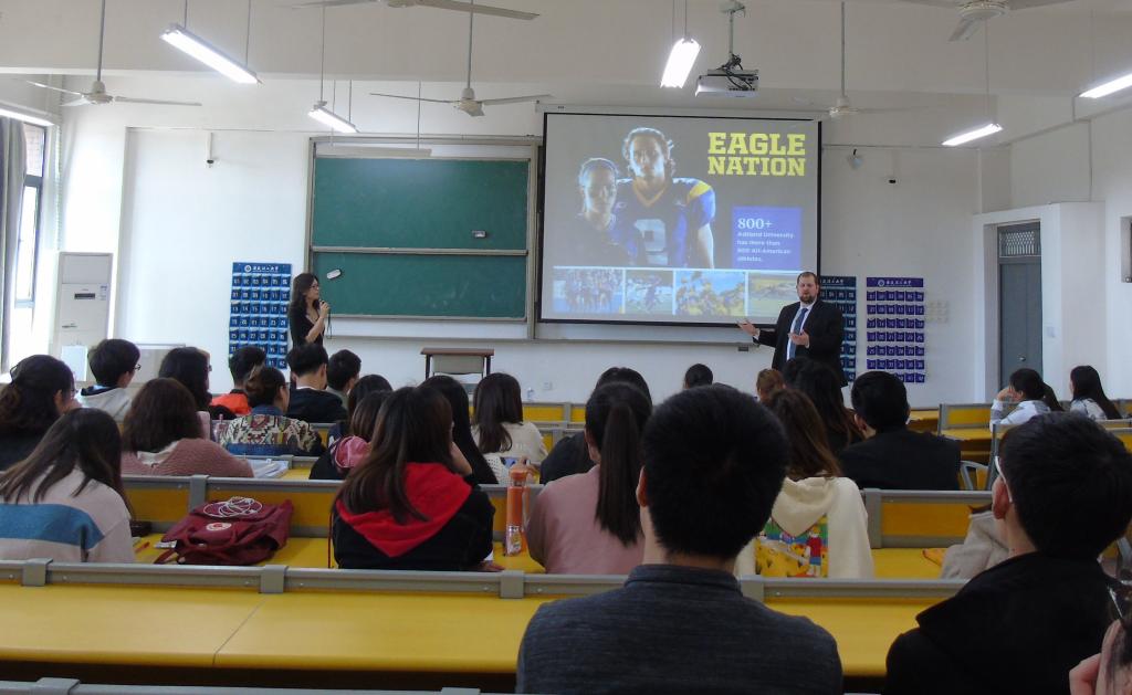 会议结束后,特洛伊·米勒一行在明理南楼312教室就学校与阿什兰大学联合培养硕士生项目作专题报告,介绍了阿什兰大学的人文历史、校园环境及相关学院学科设置的基本情况,以及学生联合培养项目申请条件、申请流程和相关费用等。
