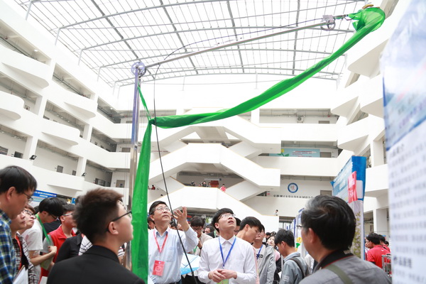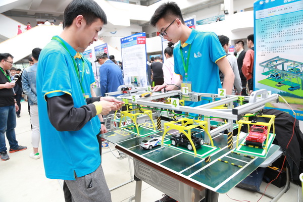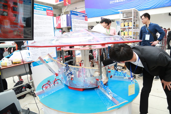 小记在现场看到,原来一个车库的设计也可以有七十二般变化的:折叠、平移、旋转、上升……在一件名叫“可折叠插齿式停车库”的作品前,绿色的草坪上放置着一个方方正正的机械装置,小记开始觉得奇怪,心想:这样的一个车库,车该往哪停呢?好像没有看到能容纳车辆的空间。参赛选手仿佛看出了记者的疑问,作品负责人机械工程学院16级机械电子工程专业的钱鸿巍开始向我们演示它的神奇:只见原本紧凑在一起的装置慢慢地舒展开,一下子有四个空车位呈现在眼前,车辆可以自由升降,平台又可以任意合并和展开。钱鸿巍介绍道:“这件作品由插齿式停车位、剪叉式升降台和可折叠框架组成,集自由伸缩功能、升降台升降功能和整体框架折叠功能于一身,大大提升了车库的空间利用率,相当于一个车位可以停放四辆车。”小记不禁竖起了大拇指,忍不住赞叹:“这个车库厉害了!”