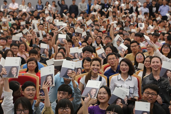 近2个小时的报告会现场气氛热烈、互动频繁,同学们不仅向朱迅表达了对她主持风格的喜爱,交流了自己在面对人生选择时的迷茫与困惑,还通过日语对话、古诗对答等方式进行了交流。在主题报告、观众互动等环节结束后,朱迅还与全场读者合影留念,耐心地为读者签名留念。