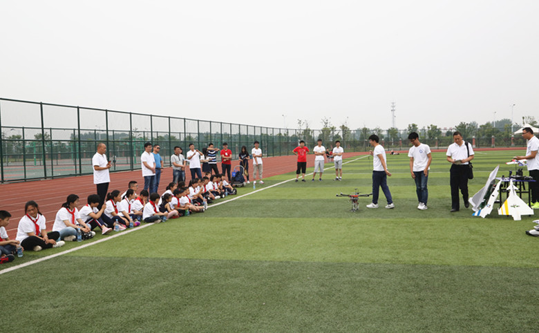 在仁爱体育场上,航模协会的大学生志愿者们向小岗学校师生们展示了航模飞行表演。一会儿低空飞行,一会儿冲上云霄,一会头顶盘旋,各种花式飞行表演和特技展示,赢得了孩子们的阵阵掌声和欢呼声。“这是我们团队成员自己组装的六旋翼航拍无人机……”航模协会会长孔峥向孩子们讲解着航模知识和航模组装技巧。