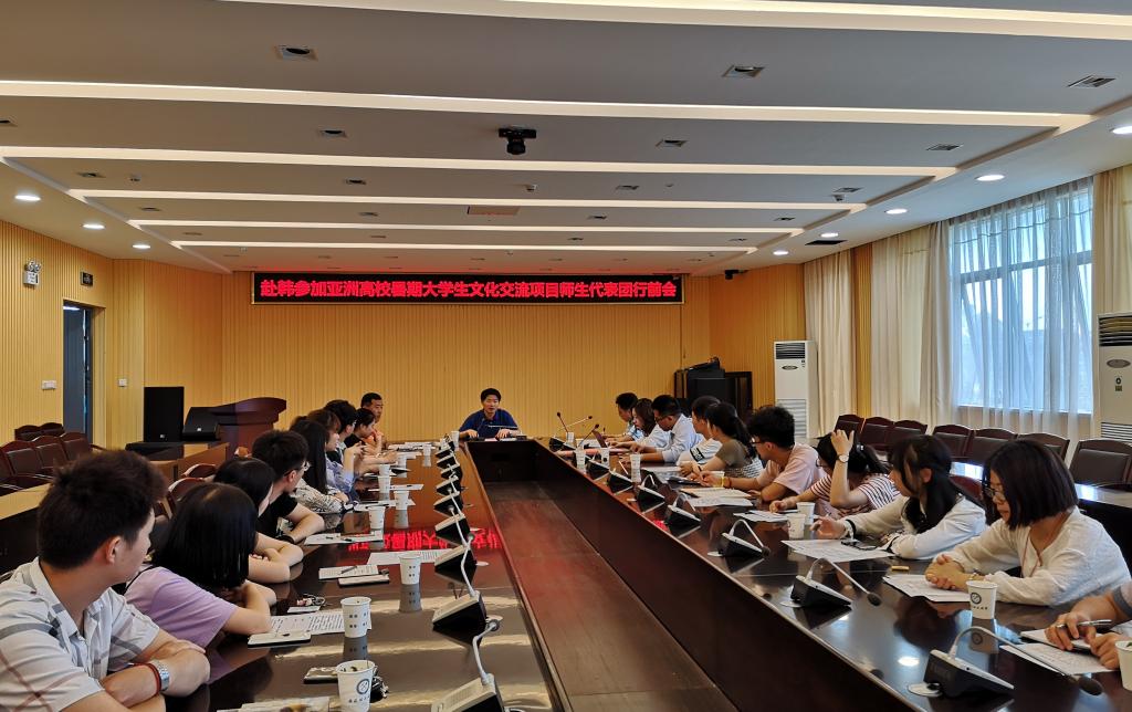 我校将于7月8日派出师生代表团22人赴东西大学参加亚洲高校暑期大学生文化交流项目,6月11日下午,学校在舜耕苑二楼会议室召开赴韩师生行前教育会议。副校长孟祥瑞出席会议。