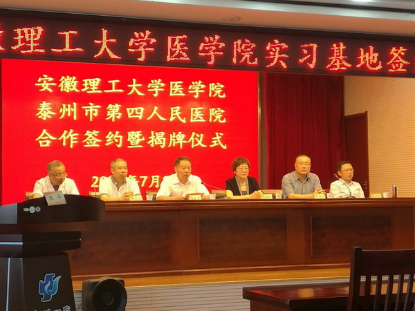 7月26日上午,安徽理工大学医学院临床实习基地签约暨揭牌仪式在泰州市第四人民医院多功能厅举行。副校长宫能平出席本次签约揭牌仪式并代表学校讲话。
