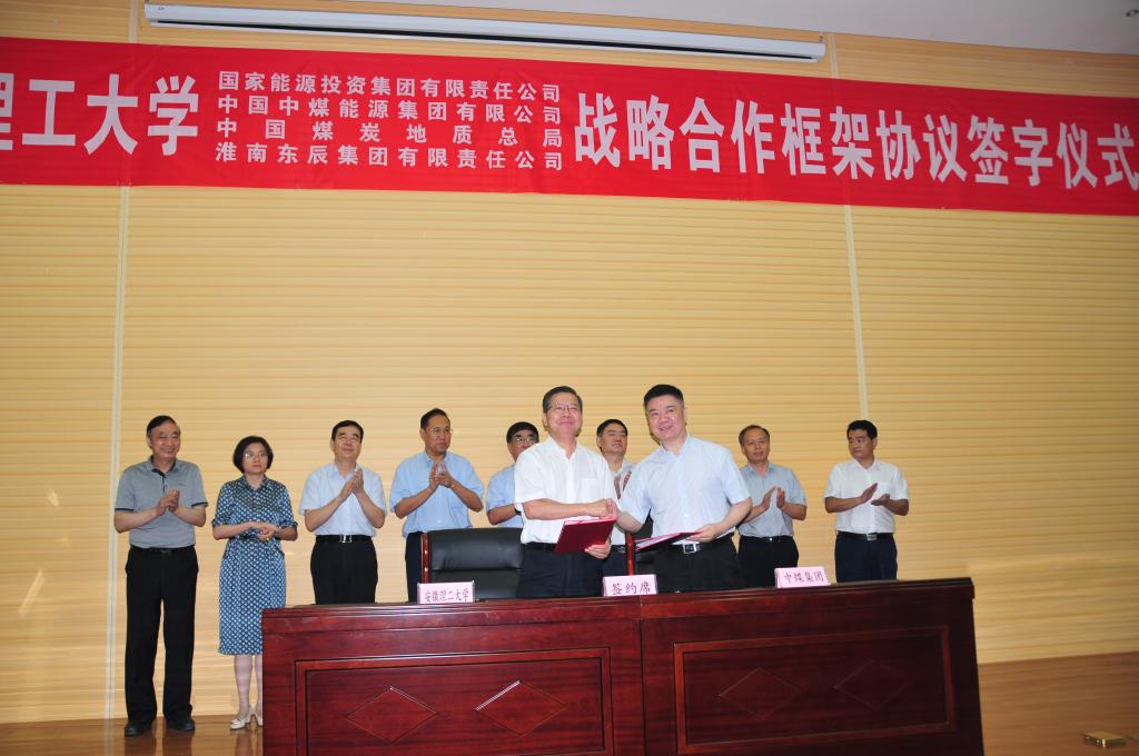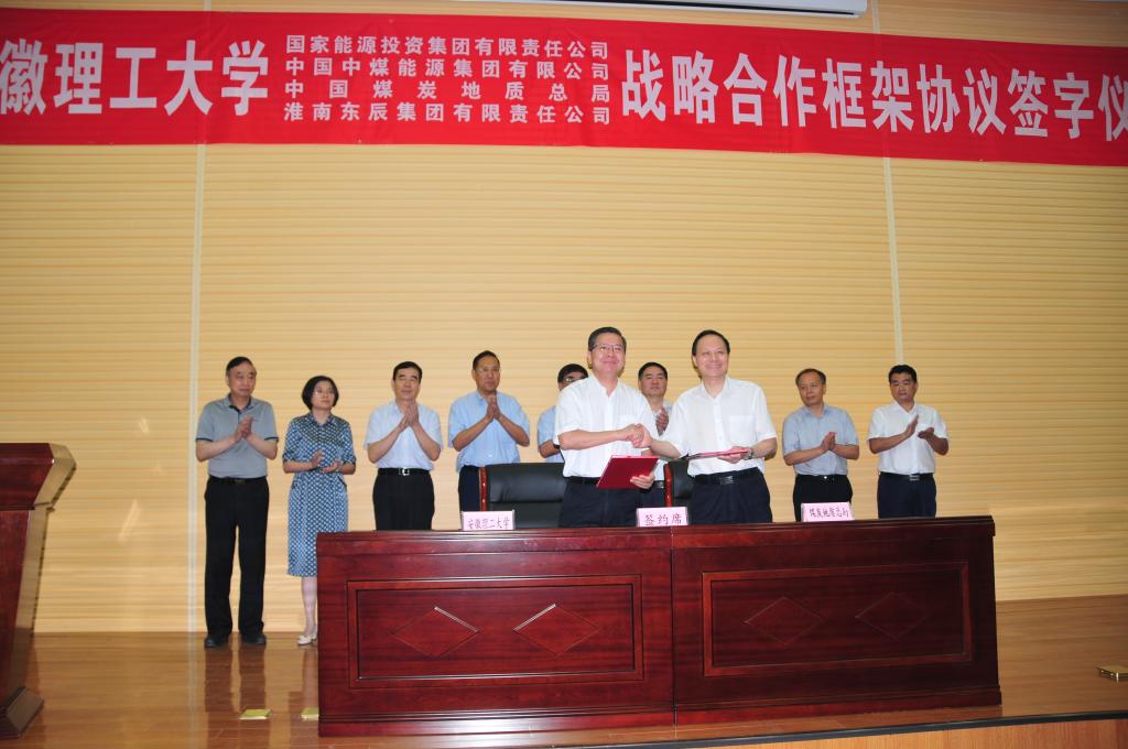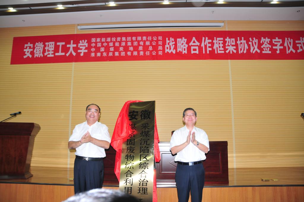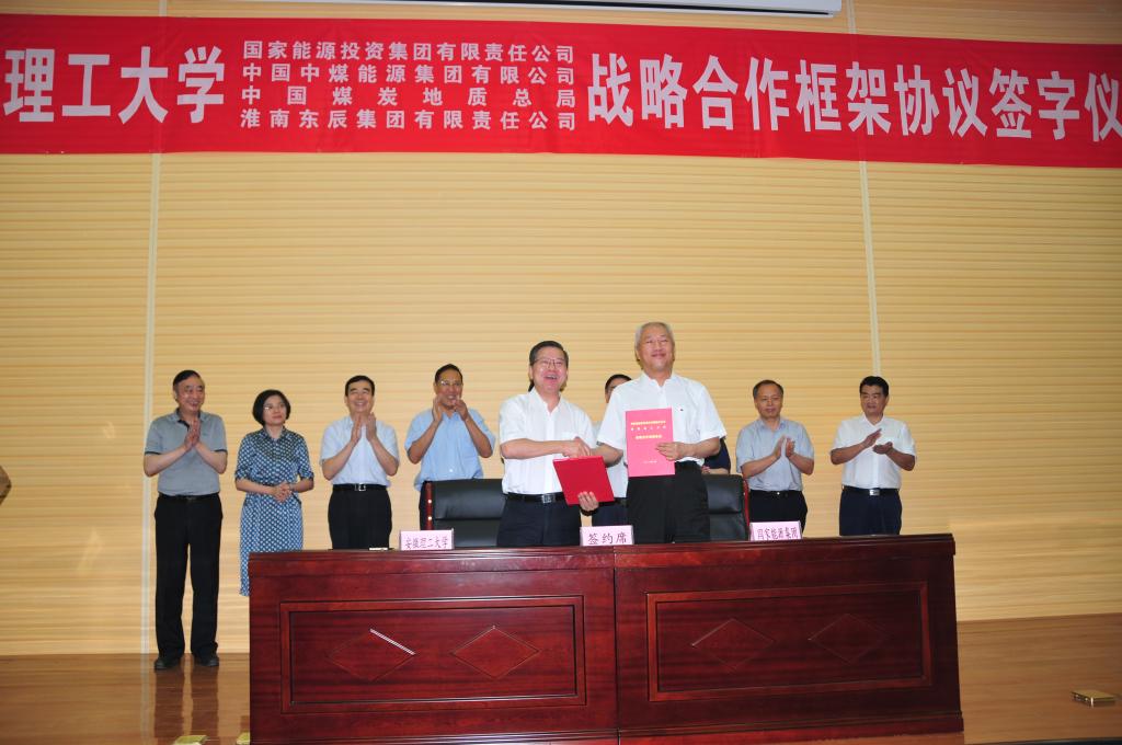 8月7日下午,安徽理工大学与国家能源投资集团有限责任公司、中国中煤能源集团有限公司、中国煤炭地质总局、淮南东辰集团有限责任公司战略合作框架协议签署仪式,以及安徽煤系固废物综合利用与采煤沉陷综合治理研究院成立揭牌仪式在校国家重点实验室一号会议室举行。特邀嘉宾:安徽省政协副主席、安徽省教育厅厅长李和平,中国工程院谢克昌院士、彭苏萍院士、段宁院士、王双明院士,淮南市副市长陆晞;四家签约企业负责人:国家能源集团党组副书记、总经理凌文院士,中国中煤能源集团有限公司总工程师祁和刚,中国煤炭地质总局党委副书记、副局长任辉,淮南东辰集团有限责任公司党委书记、董事长李懋;在校校领导:郭永存、袁亮、郑明东、吴照明、宫能平出席签约仪式。