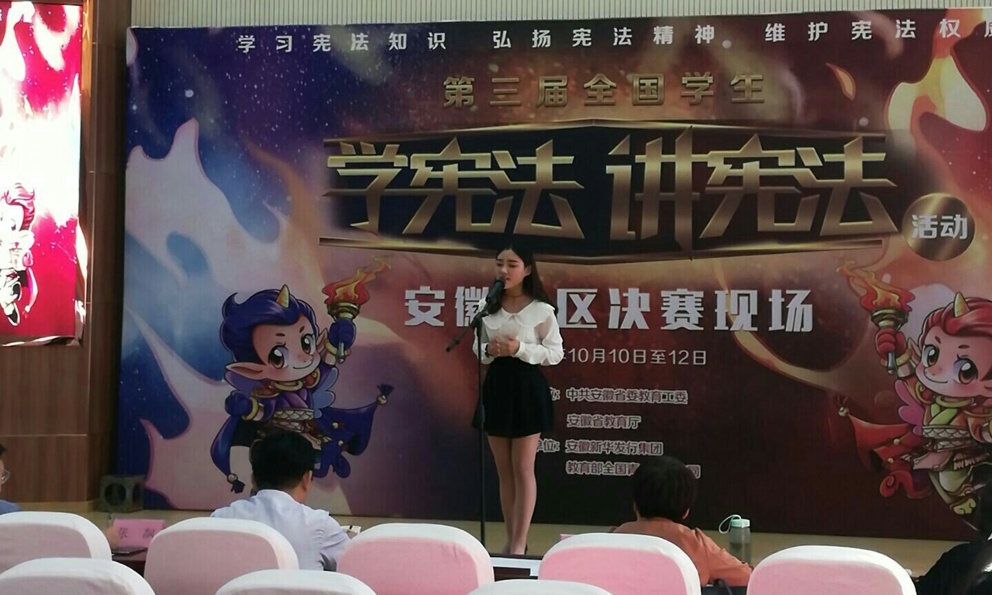 10月11日至12日,第三届全国学生“学宪法 讲宪法”演讲比赛安徽赛区决赛在合肥举行。安徽赛区决赛分小学、初中、高中、高校4个组别。高校组全省共有20所高校的20名选手进入最后总决赛。我校计算机科学与工程学院数字媒体16级1班王子莹同学代表学校参赛,获得高校组省级三等奖。