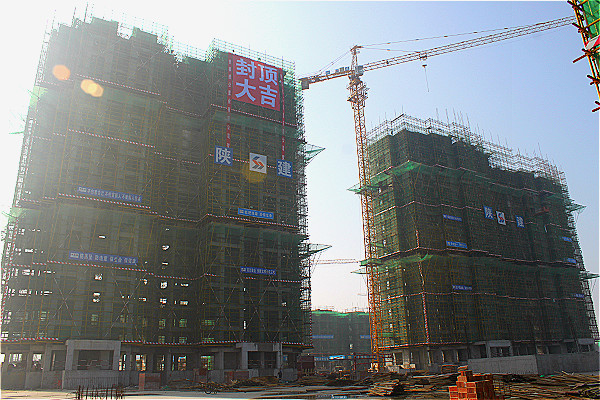 自10月中旬至11月下旬,因受国家、省、市环保影响,工地现场现在约1万立方米左右的混凝土等待浇筑。目前,除9栋楼正在地下室结构施工外,其余12栋楼都在地面以上施工,7个区域地下车库的主体结构施工已完成约65%。根据工程进度横道图,工程正按照计划有序推进,确保明年9月份全面交付。