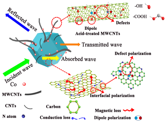 Co/Zn-MOFs derived porous Co-C/MWCNTs纳米复合材料的电磁波吸收机制示意图