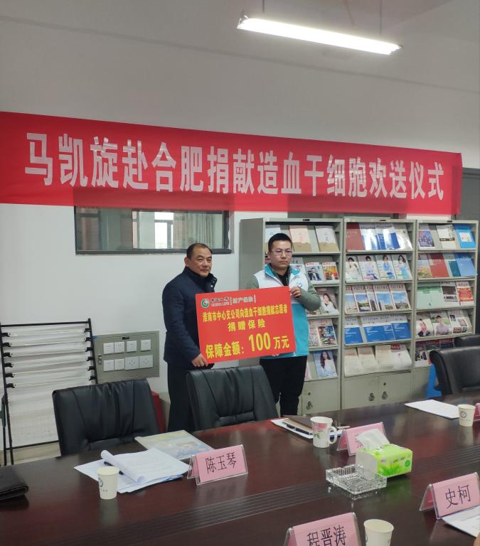 欢送仪式上,国寿财险公司负责人向马凯旋同学捐献志愿者意外伤害保险。淮南市往届捐献者鲍广红为马凯旋献鲜花。