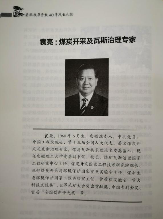 在《安徽改革开放40年风云人物》一书中,由我校党委宣传部崔琴同志执笔撰写的《袁亮:煤炭开采与瓦斯治理专家》,用5千多字的篇幅,分别从“扎根煤矿 脚踏实地的进行曲”、“荣膺院士 仰望星空的协奏曲”、“躬耕教育 赤子之心变奏曲”三个篇章,图文并茂地呈现了袁亮院士在改革开放四十年历程中的华彩乐章。